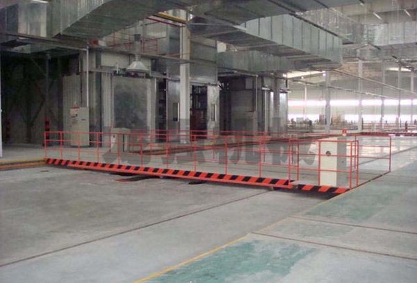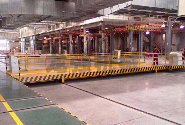 • KPG滑觸線電動平移換軌車供電方式是:在軌道側(cè)面開設地溝,地溝內(nèi)安裝安全滑觸線,地溝上鋪有單面用鉸鏈固定于地上的蓋板或安裝于地溝的側(cè)面。電動平車運行時通過安裝在地溝翻板裝置,將蓋板掀起,翻板裝置內(nèi)有同安全滑觸線集電器聯(lián)接的電纜。電動平車通過后蓋板自動放回地面,能保證無軌車輛順利通過。KPG側(cè)滑觸線電動平車不受運行距離的限制。將交流380V的安全滑觸線直接引入平車交流控制系統(tǒng),來控制平車的啟動、停止、前進、后退等。通過平車的移動帶動安全滑觸線的滑塊來實現(xiàn)給平車供電,安全滑觸線受安裝未知的限制,可以安裝在地溝內(nèi)側(cè)墻體上,來實現(xiàn)地溝內(nèi)的電源引入軌道平車上,操作系統(tǒng)為低壓AC36V電源控制。是車間流水生產(chǎn)線的 ;該平車適用于運行距離不長(≤200m)、使用頻率極高、整車高度較低、流水線作業(yè)等場合。